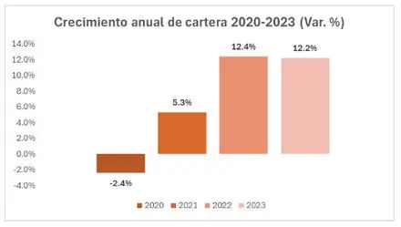 De acuerdo con el análisis se observa que la tasa de expansión del valor del portafolio de préstamos se mantuvo estable alrededor del 12%, ritmo similar al  del año anterior. Poco más de la mitad de ese incremento fue atribuible a la ampliación de la base de prestatarios. Un mayor crédito promedio explica el resto de la variación.