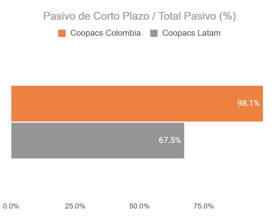 El promedio de Coopacs Colombianas evidencian un ratio de liquidez comparativamente más holgado que el del Benchmark Latinoamericano, aunque con una alta concentración de captaciones con madurez (vencimiento) de muy corto plazo (98% del total de su pasivo versus 67% en benchmark comparable). Liquidez Esta estructura puede restar flexibilidad en el manejo de calces entre activos y pasivos. En la experiencia de MicroRate, en la medida que el mercado es más competido existe mayor presión para ampliar el plazo de repago de los créditos colocados, potenciando brechas de corto plazo