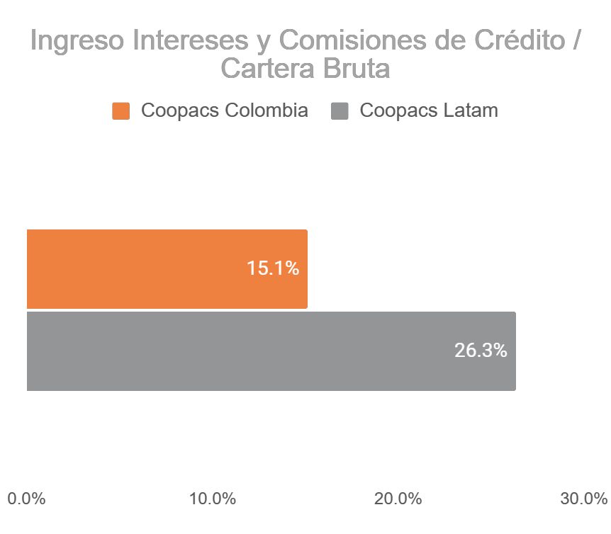 El rendimiento de cartera promedio (medido como los ingresos financieros respecto a la cartera colocada) es uno de los más bajos vistos por MicroRate a nivel Latinoamérica. En cierta medida, este resultado no solo se explicaría por topes a la tasa de interés local (“tasa de usura” para microcrédito, por ejemplo); sino también por el nicho atendido; tipo de producto crediticio; riesgo crediticio. En la experiencia de MicroRate, las tasas de interés a nivel Cooperativas suelen ser comparativamente más bajos dado su típico enfoque en un balance financiero-social.