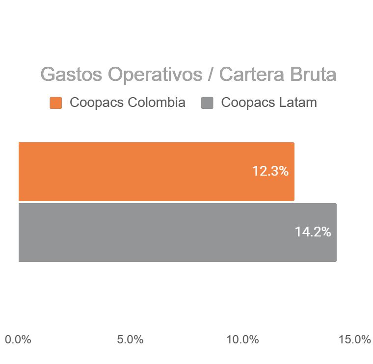Este menor ratio de generación de ingresos financieros les obliga a un esquema en eficiencia operativa y financiera. Como consecuencia logra un indicador de gastos operativos de 12.3%, mejor al registrado en el Benchmark MicroRate Cooperativo de Latinoamérica.